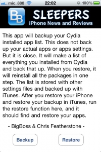 AptBackup is a little tool that backs up a list of your installed Cydia apps and when you restore your iPhone in iTunes, will reinstall all the packages in one step. AptBackup does not back up the actual physical apps but keeps a list of them which is stored with other settings files and backed up in iTunes.